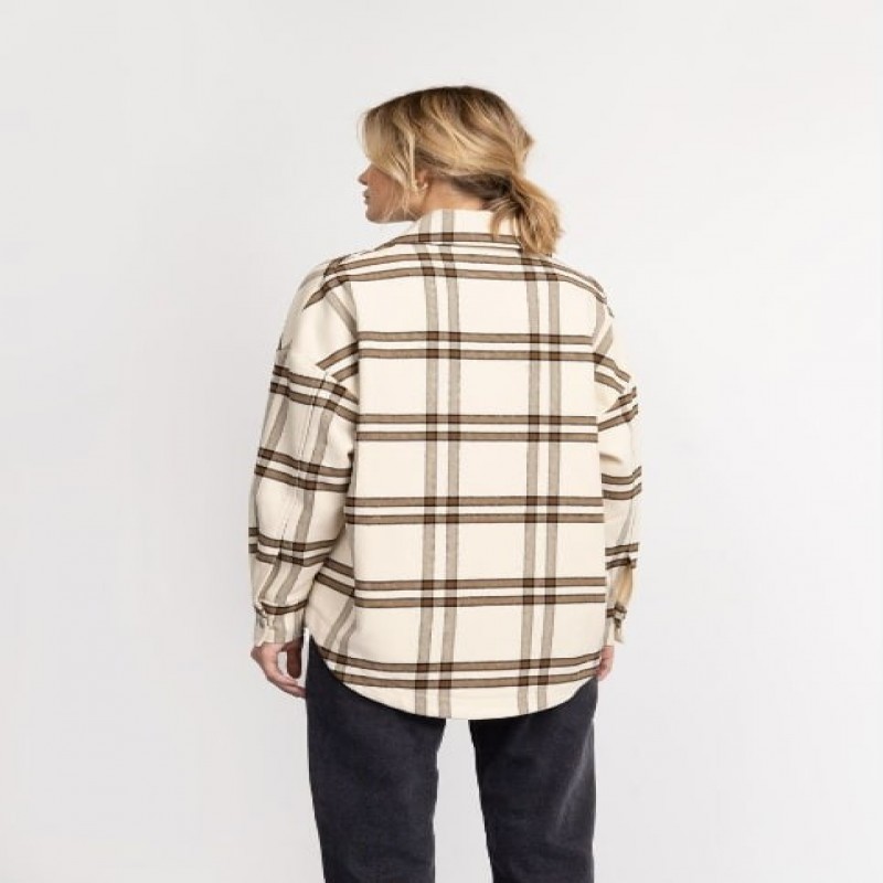 Une chemise beige laconiques à grands carreaux marron - c'est à la fois un look élégant et décontracté tendance de cette saison. La chemise pour femme est fabriquée en doux tissu flanelle avec un léger duvet, qui offre des sensations tactiles incroyables, enveloppant confortablement le corps. Modèle décontracté pour jeunes avec une coupe droite confortable et une ligne d'épaule abaissée qui offre une liberté de mouvement totale. À l'avant de la chemise à carreaux de style anglais se trouvent de grandes poches passepoilées. La chemise chaude se fixe avec des boutons métalliques pratiques. Les longues manches de la chemise décontractée avec des plis et de larges poignets à boutons se ferment solidement.Chemise élégante en tissu mélangé avec col rabattu - un article polyvalent pour les promenades, les voyages à la campagne, les voyages, les vacances et comme option de vêtement d'extérieur pour la mi-saison. La chemise peut être portée seule, comme une veste ou être utilisée pour créer des combinaisons intéressantes en couches avec des t-shirts en tricot, des tops ou des pulls à col roulé. Développer la description polyester 37%, viscose 60%, élasthanne 3%Description
