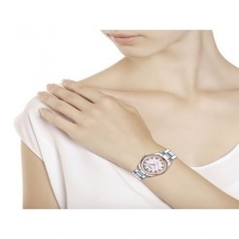 Montre de luxe pour femmes en or et acier collection Unity for her. Boîtier en acier inoxydable hypoallergénique 316L, lunette en or rose 585, fond en acier 316L, mouvement à quartz suisse Ronda 763, verre saphir, bracelet en acier 316L. Diamètre du boîtier 31 mm, largeur du bracelet 16 mm. Étanchéité 5 ATM. Incrustations sur le cadran en diamants : 1,1 mm - 12 pièces, 0,097 carat. Garantie de 3 ans à partir de la date d'achat.