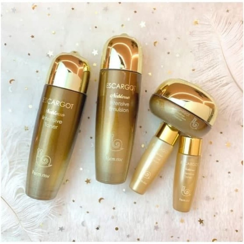 Le coffret cadeau rajeunissant pour la peau du visage avec extrait purifié, obtenu à partir de la slime d'escargot royal - c'est immédiatement 3 produits de soin efficaces pour une nutrition, une hydratation et une restauration quotidiennes de la peau. Le set Farmstay Escargot Noblesse Intensive Skin Care 3 Set comprend un tonique pour la restauration de la peau (150 ml/30 ml), qui élimine tous les signes de sécheresse de l'épiderme, raffermit et lisse, favorise l'augmentation de l'immunité cutanée. Le tonique pour le visage lisse les irrégularités de la texture, éclaircit la pigmentation et les rougeurs, aide en cas d'inflammations. L'émulsion pour l'hydratation et le renforcement de la peau (150 ml/30 ml) avec **extrait d'escargot royal** complète l'effet positif du tonique, normalise l'équilibre hydrolipidique, donne de l'élasticité et de la fraîcheur, égalise la microtexture de l'épiderme. Crème pour le visage nourrissante, hydrate, éclaircit la peau (50 g), avec **extrait d'escargot** ralentit les processus de vieillissement, stimule la production de **collagène**, améliore la circulation sanguine, rend la peau lisse et douce.